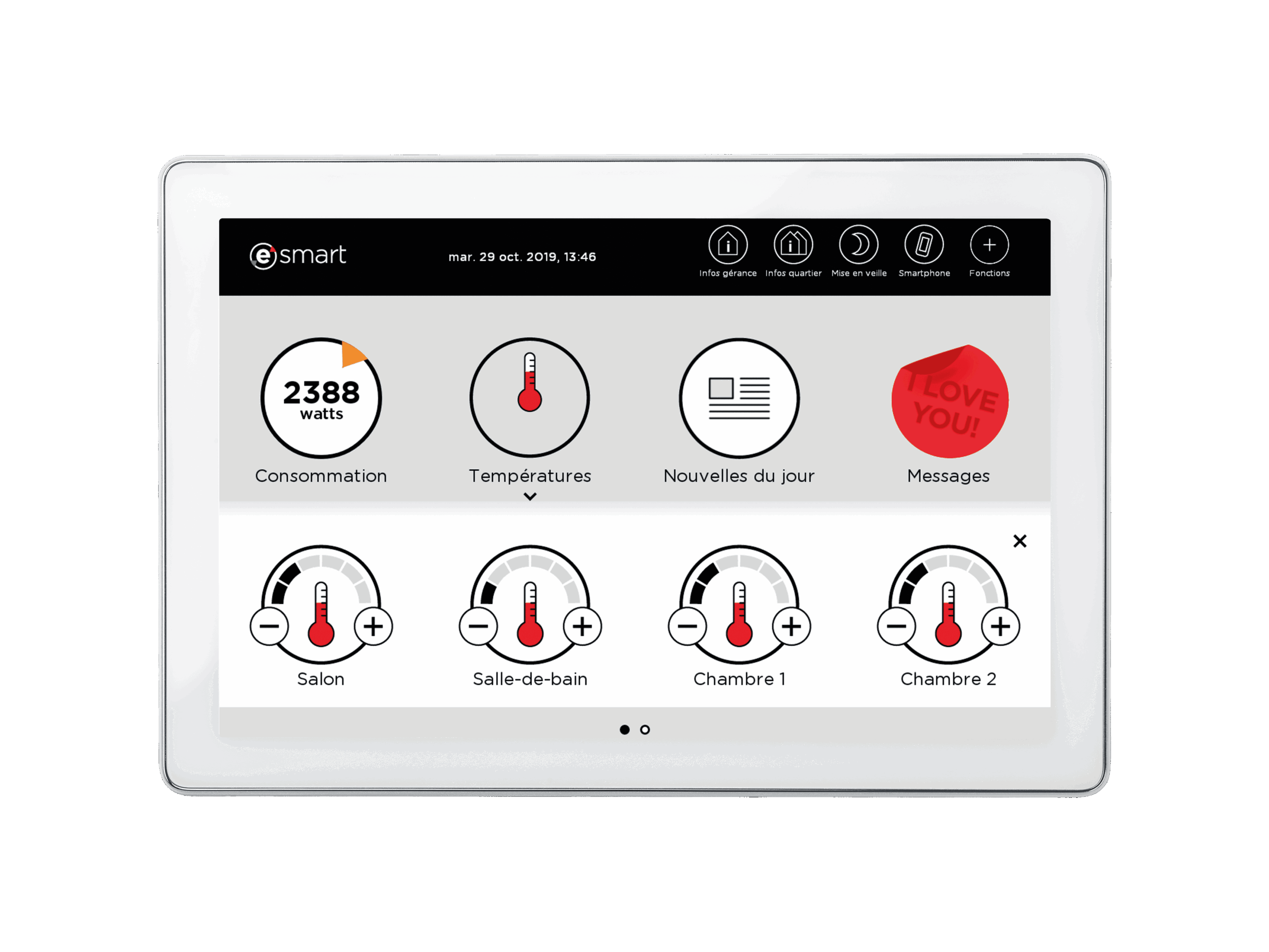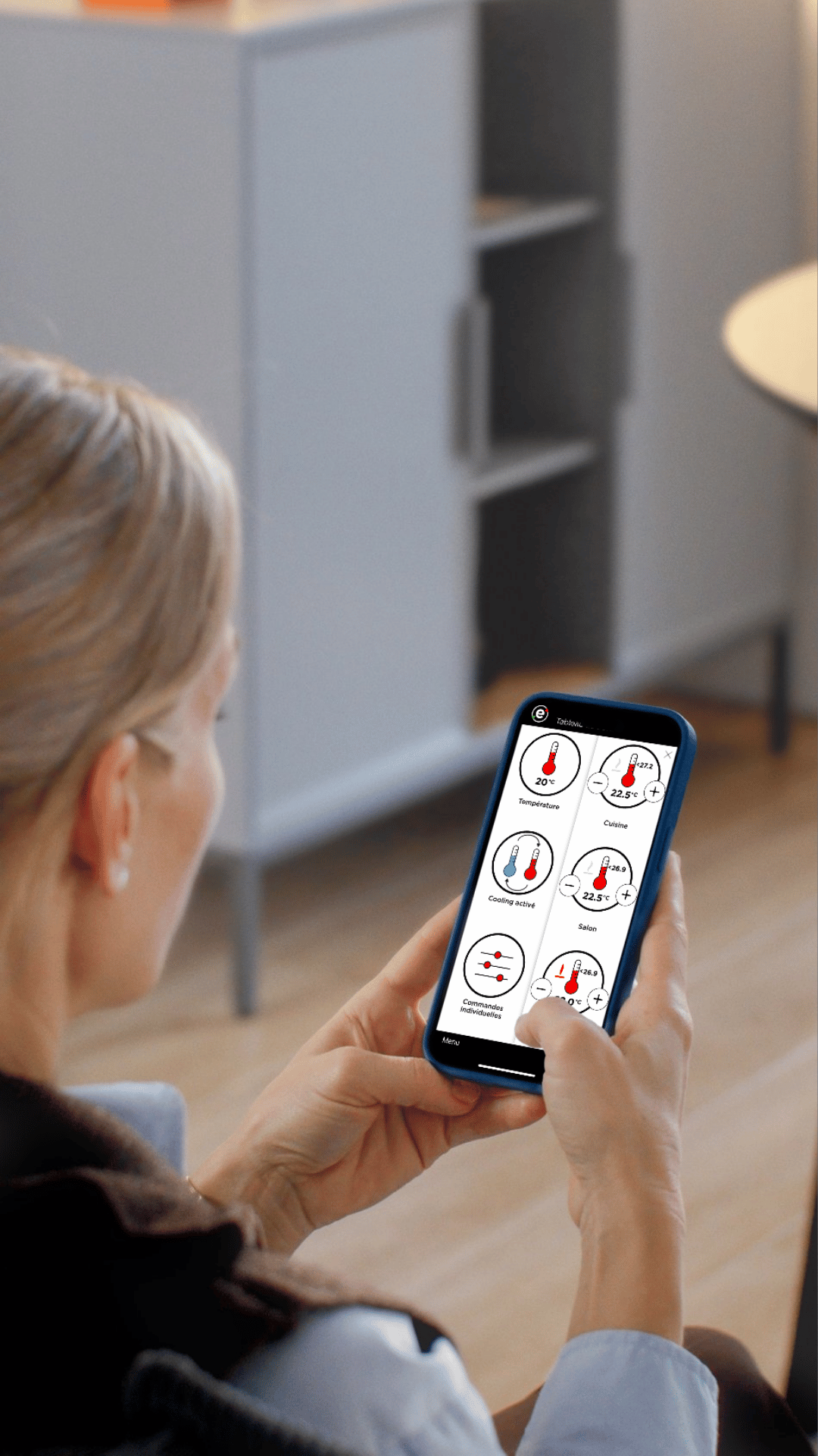 Dank der eSMART-Technologie lassen sich die Temperatureinstellungen der verschiedenen Heiz-zonen in der Wohnung mit einem Klick anpassen, über das Symbol „Temperatur“ auf dem Wandbildschirm oder über die mobile App.