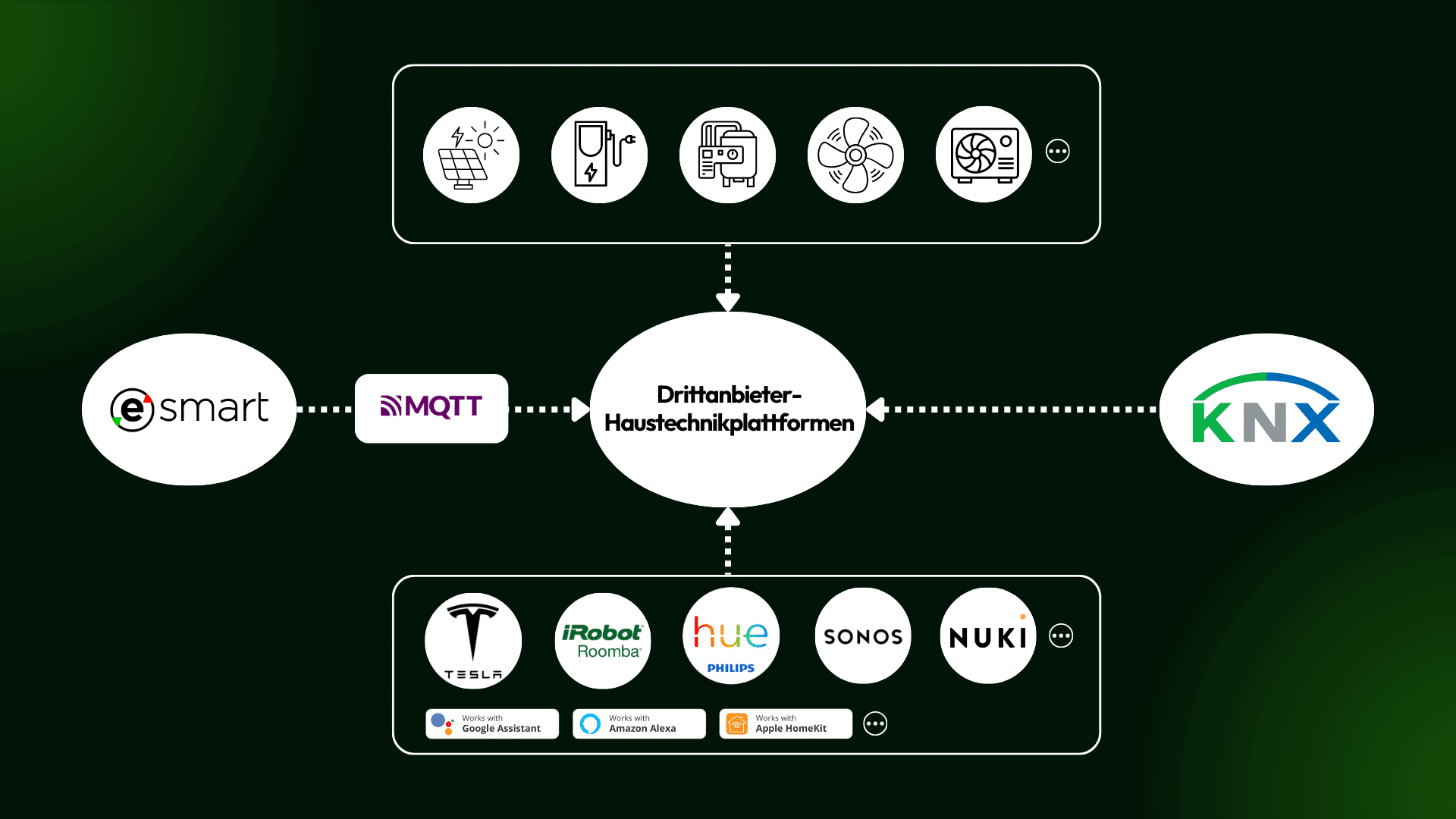 eSMART ermöglicht eine nahtlose Integration mit anderen vernetzten Geräten und bestehenden Smart Home Systemen wie Wärmepumpen, motorisierten Jalousien, Elektrofahrzeugen oder anderen Geräten, ohne an eine bestimmte Marke oder einen Hersteller gebunden zu sein.