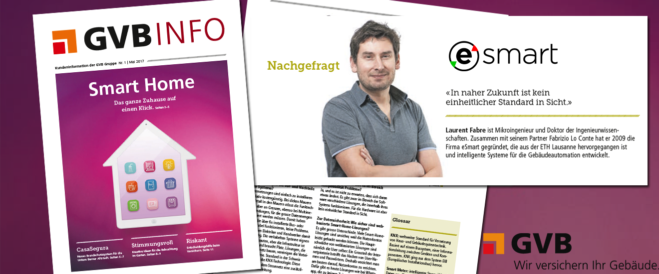 Das Informationsmagazin der Gruppe GVB (Gebäudeversicherung Bern) interviewte Laurent Fabre, Mitgründer des Unternehmens eSMART. Die Firma entwickelt intelligente Systeme für die Gebäudeautomation.