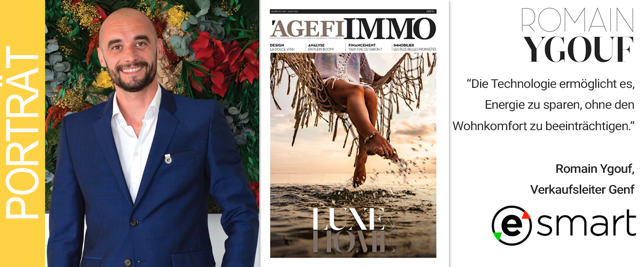 Das Magazin AGEFI IMMO porträtiert Romain Ygouf, Commercial Manager eSMART in Genf. AGEFI Immo ist einzigartig und präsentiert die schönsten Immobilienobjekte, die in der Schweiz zum Verkauf angeboten werden. Dank seiner Rubriken Makler, Promotionen, Gewerbeflächen und Wohnungsvermietung bietet AGEFI Immo ein besonders breites Angebot. AGEFI Immo bietet eine außergewöhnliche und gewagte Erfahrung bei der Immobiliensuche, bei der dank seiner einzigartigen Dimension Fotos im Vordergrund stehen.