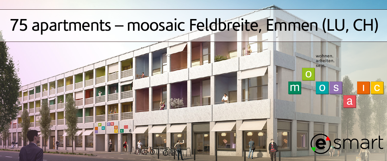 Dans le quartier urbain et animé de «Feldbreite» au milieu de Emmen, « moosaic 6 » et « moosaic 18 » se sont construits. Les deux immeubles résidentiels et commerciaux de quatre étages, situés dans une localisation exceptionnelle, attirent le regard par leur fraîcheur tendance. Les façades de « moosaic » se caractérisent par des balcons spacieux qui se présentent comme des niches de couleurs individuelles et privées – comme des mosaïques qui s’unissent pour former un tout.